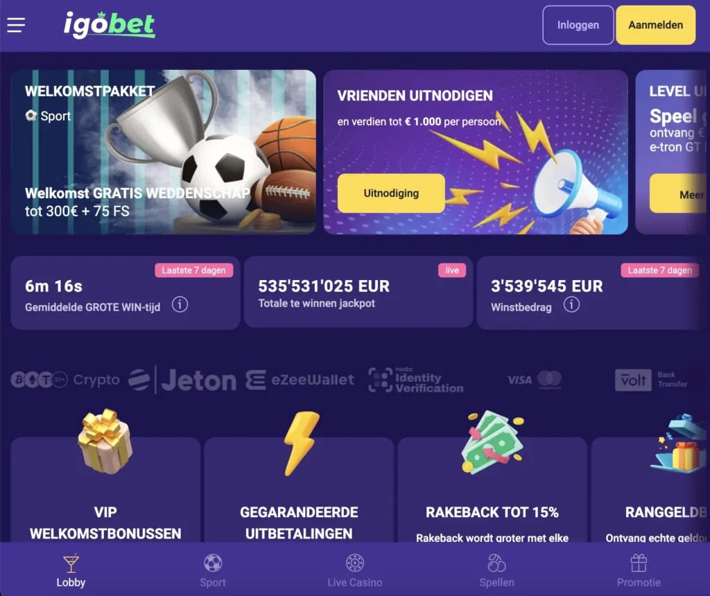 IgoBet Nieuwkomers kunnen profiteren van royale 200% welkomstbonussen tot €1.000 + 150 gratis spins en regelmatige promoties, terwijl ervaren spelers toegang hebben tot spannende toernooien en een exclusief VIP-programma, met cashback, rakeback en gratis spins. Met een licentie uit Costa Rica en een focus op veiligheid en betrouwbaarheid, kunnen Nederlandse gebruikers met vertrouwen genieten van hun favoriete spellen. Betalingen worden snel verwerkt via vertrouwde methoden zoals iDEAL, Visa en PayPal.