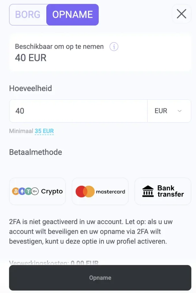 | Mastercard Debet | 1-3 werkdagen | €2.50 | €20 – €5,000 | 97.9% | Zelfde dag |